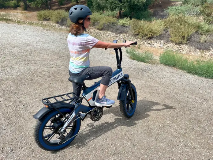 You should also consider your size when getting on and off the ebike. If you’re on the shorter end of the recommended height range (recommended size range is 5’3″-6’3″), you may find it difficult to get on and off, depending on your leg length. Be sure to check the rider size chart and note your inseam measurement.