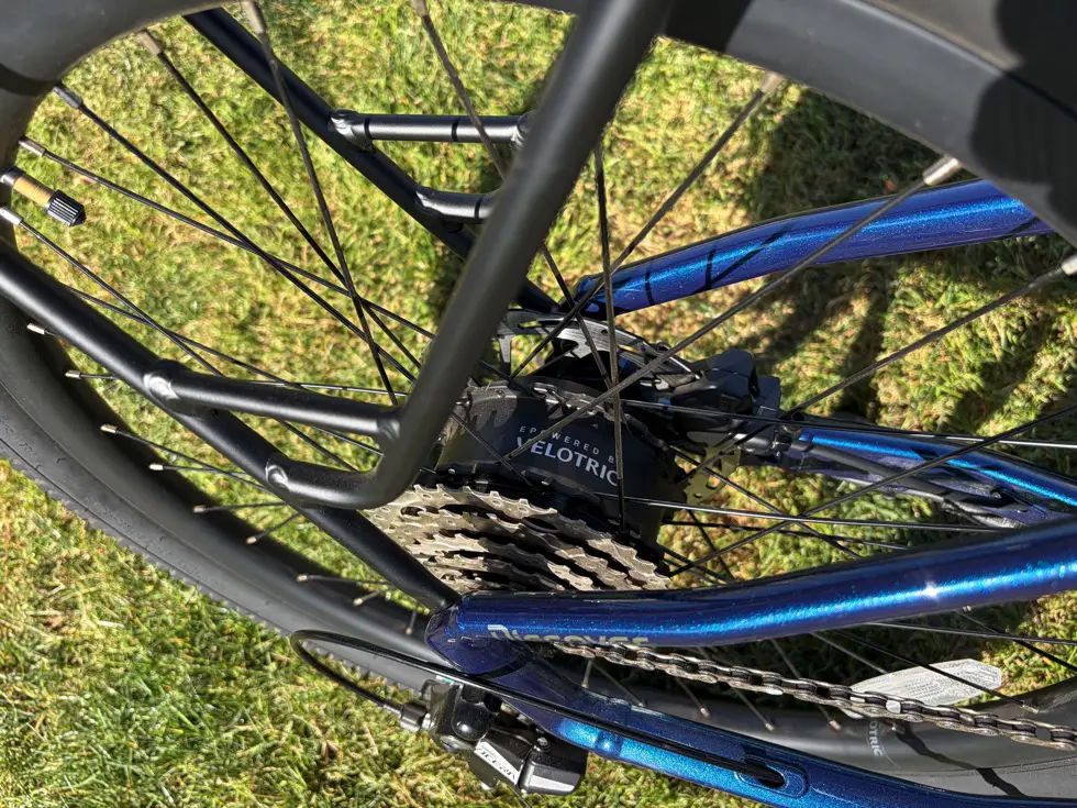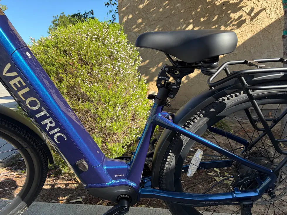 One standout feature is the suspension seatpost, which comes standard. This reduces impact on the lower back and hips, especially over rough pavement and longer rides. Many commuter e-bikes require you to add this later, so having it included makes a noticeable difference, particularly for riders with back or hip sensitivity.