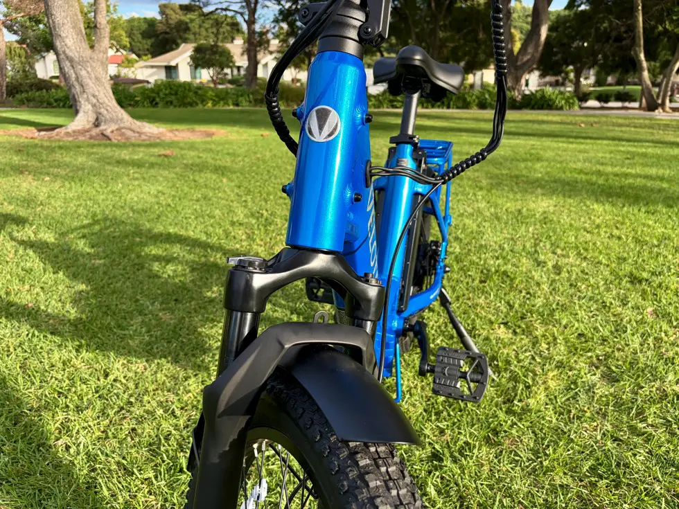 Velotric offers what they call ComfortMax. The hydraulic front suspension fork offers 60mm of travel with lockout. Combined with the 20×3″ puncture-resistant tires, the ride stays surprisingly stable over uneven surfaces: bumpy pavement, bike paths, dirt and gravel. It’s not a mountain bike, but it’s powerful and comfortable enough for taking it wherever you need to go.